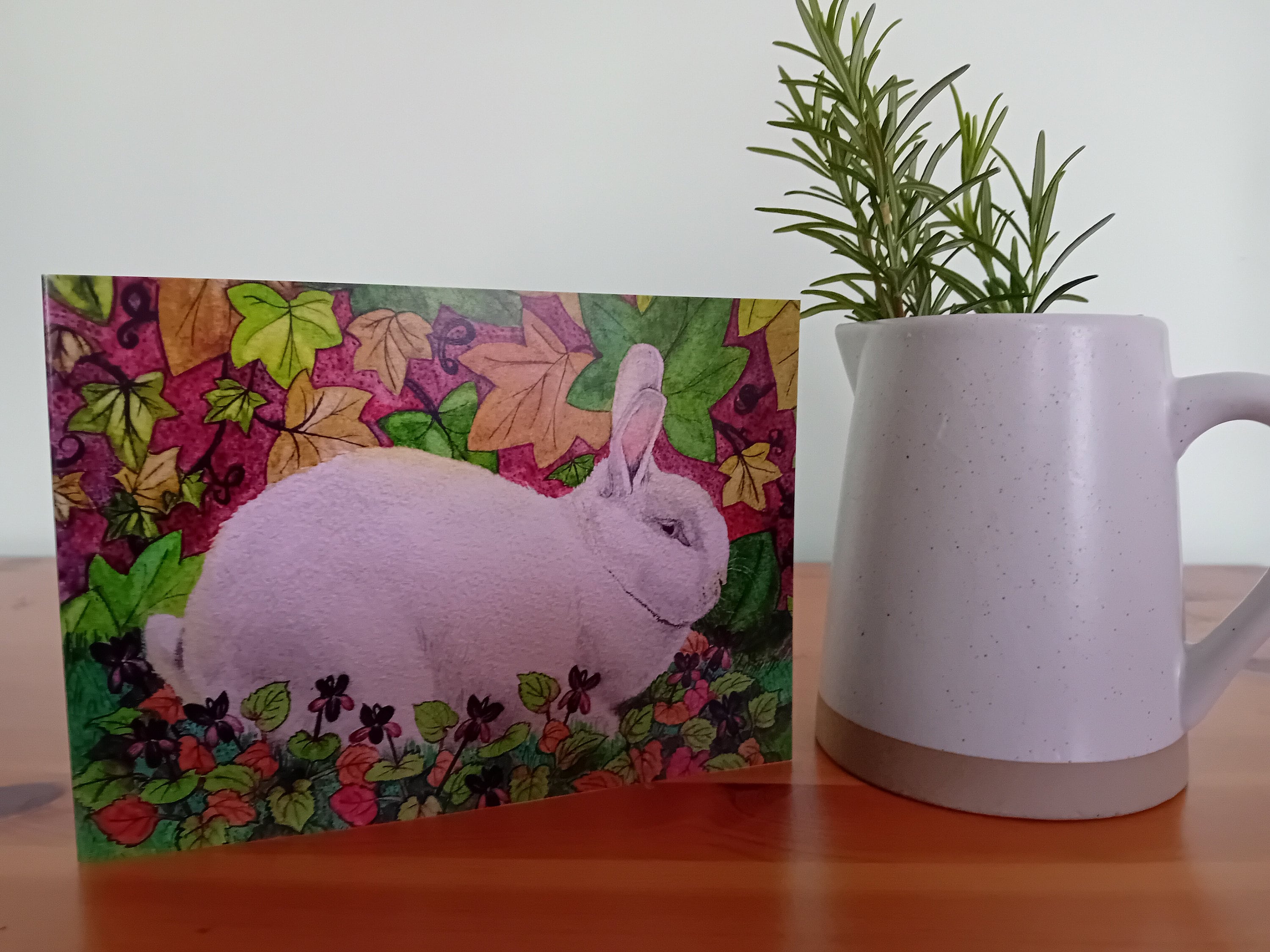 This 'White Rabbit' greetings card is from my original watercolour painting depicting a giant, white rabbit. I used to have two giant rabbits roaming free in the garden!