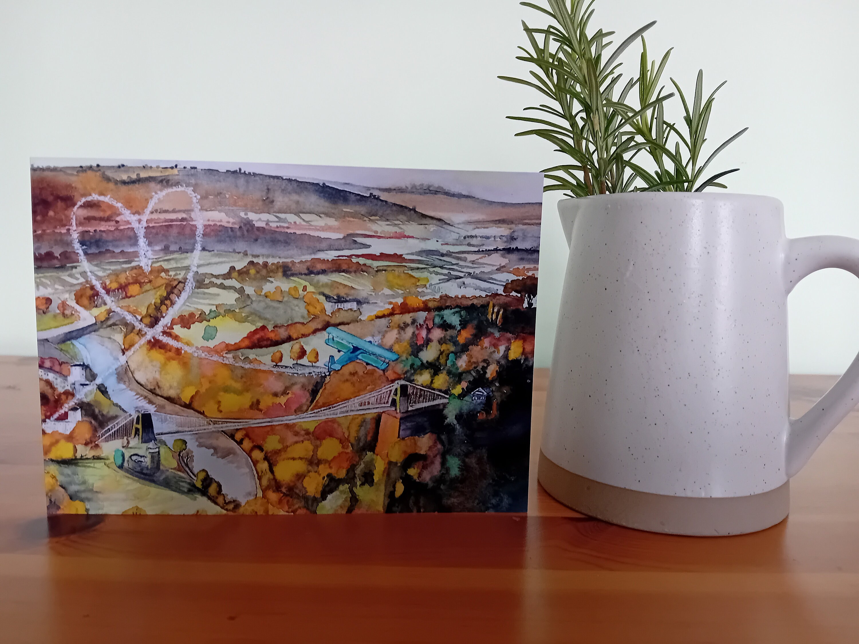 This 'Skywriting Over Bristol' greetings card is from my original watercolour painting depicting a plane soaring above the Bristol suspension bridge and surrounding landscape.