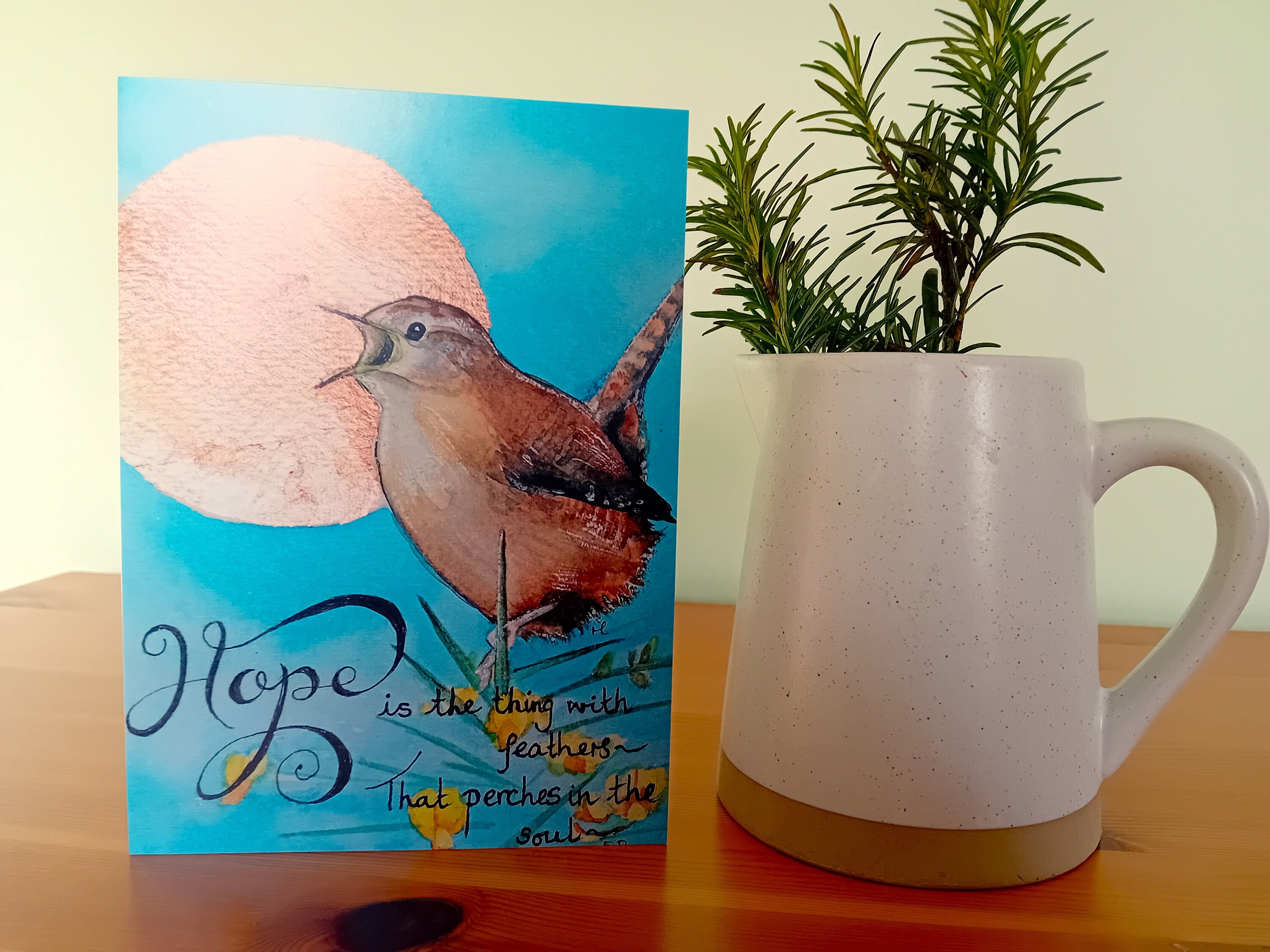 This 'Hope' greetings card is from my original watercolour depicting a wren in full song against a rose-gold sun. The quote below is from the Emily Dickinson poem 'Hope is the thing with feathers'.