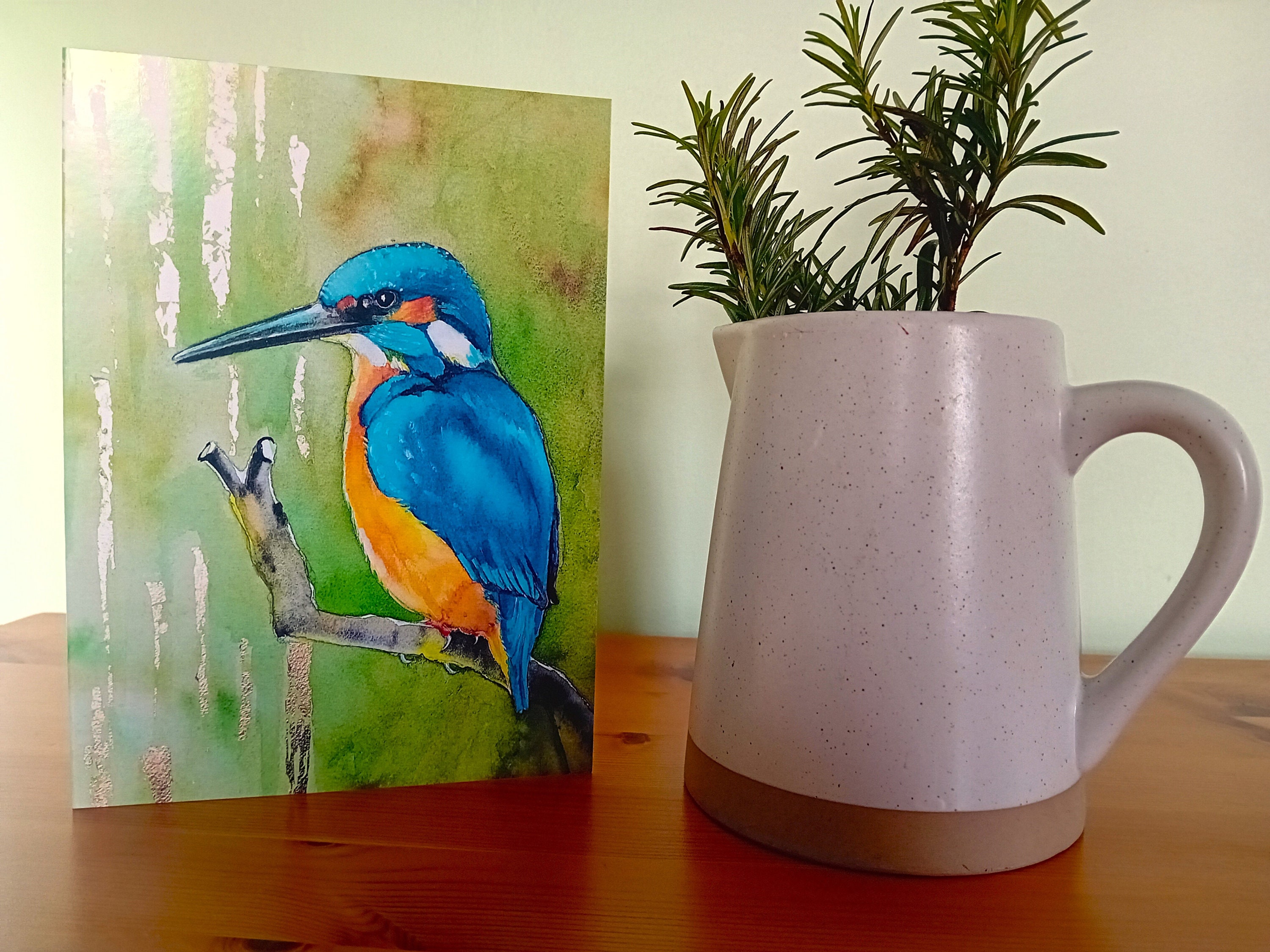 This 'Kingfisher' greetings card is from my watercolour painting of these beautiful birds. The background was created by adding gold-leaf to the painting.