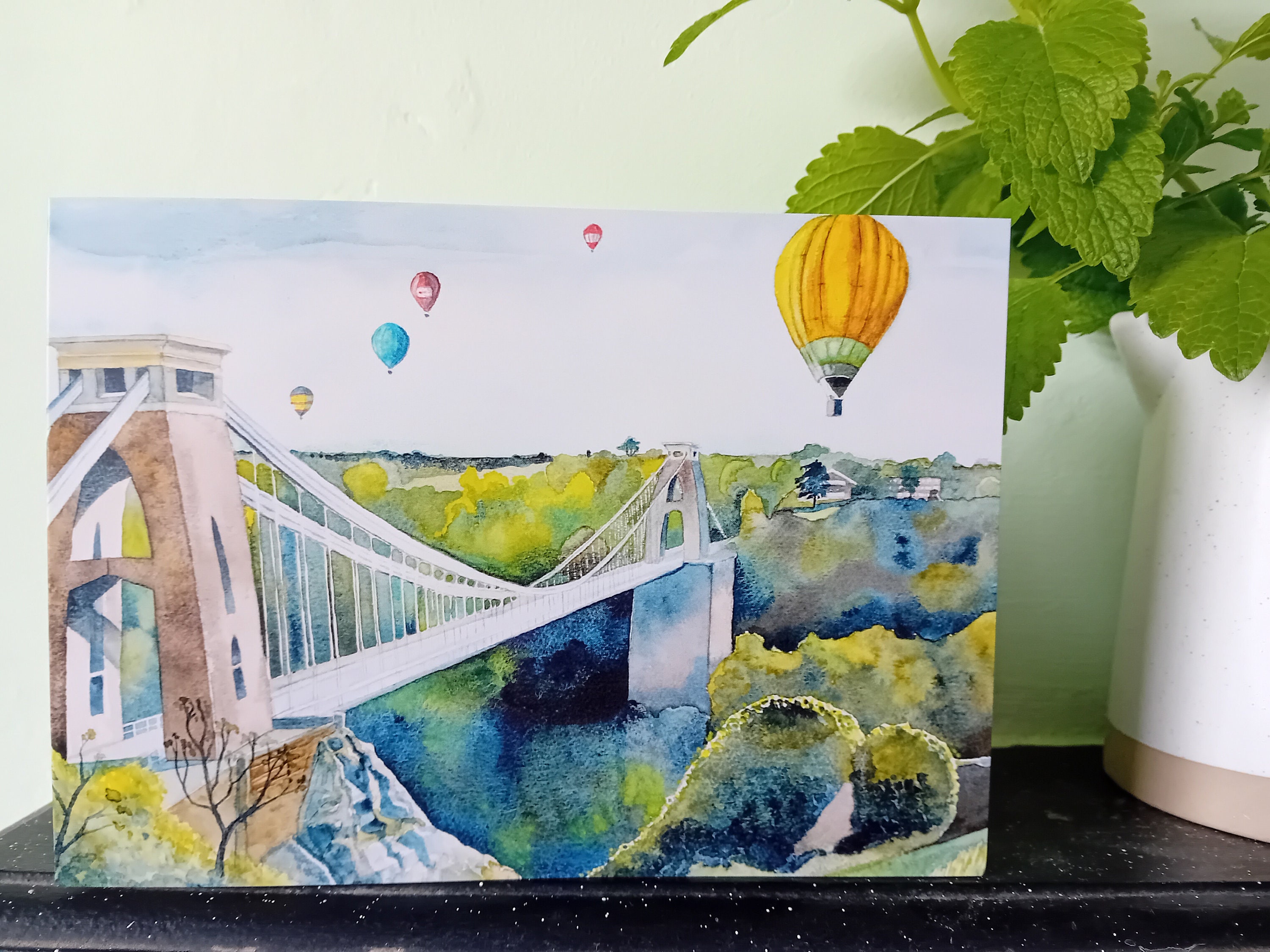 This 'Bristol Balloon Fiesta' greetings card is from my original watercolour painting of the international festival of hot air ballooning in Bristol, Somerset where hundreds of balloons take to the skies and float over the city, including, as shown here, the famous Clifton Suspension Bridge built by Isambard Kingdom Brunel.