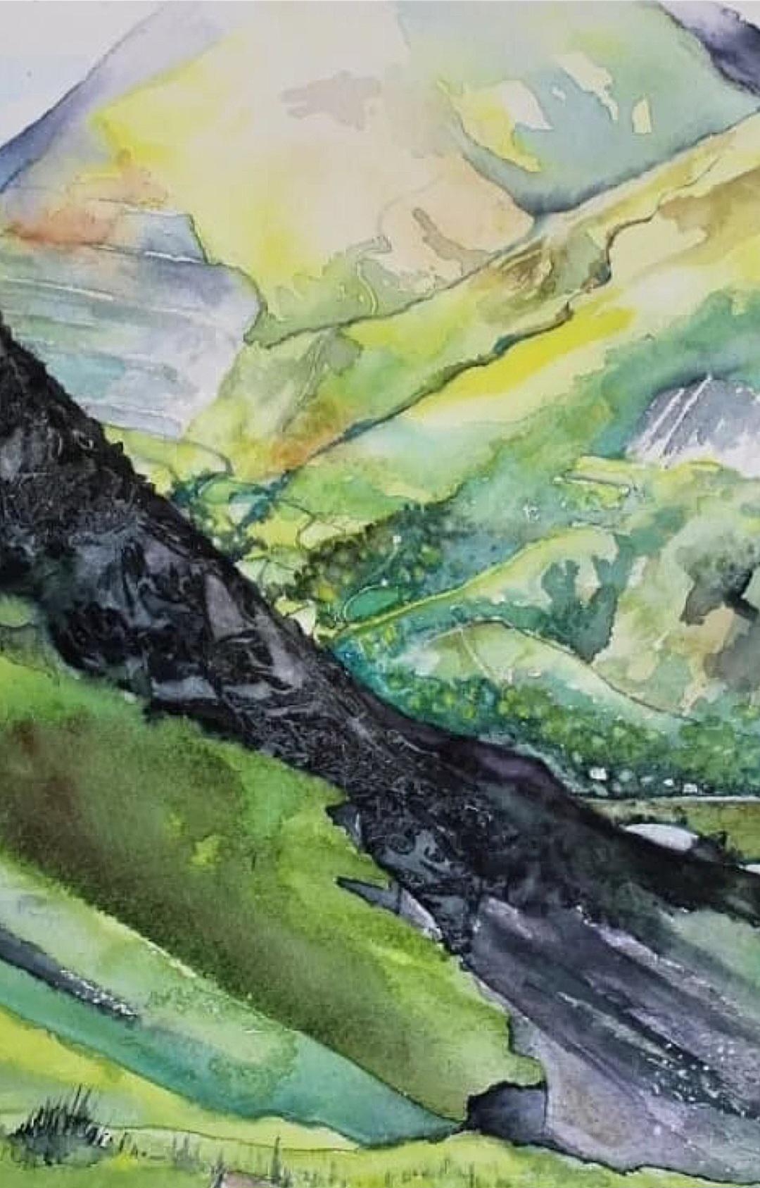 This original watercolour depicts the view down into the valleys on the way up Yr Wyddfa (Snowdon) in Wales. It's a long climb, which is relatively easy (depending on the route you choose!) with fantastic views from the top in the right weather.