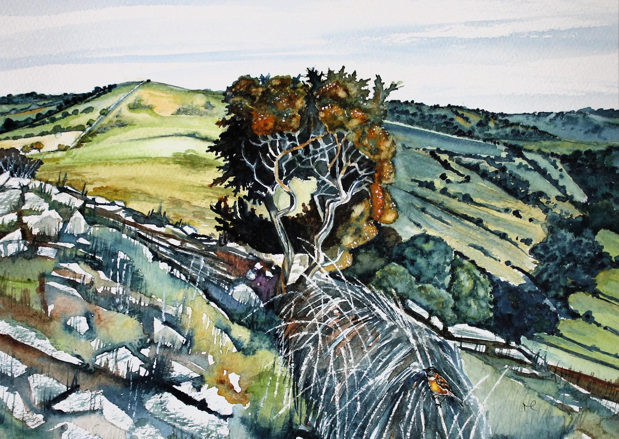 This 'Stonechat on Crook Peak' greetings card is from my original watercolour painting depicting this small bird on the limestone summit of this distinctive peak in Somerset. From there you can enjoy far-reaching views across the countryside and out to the coast.