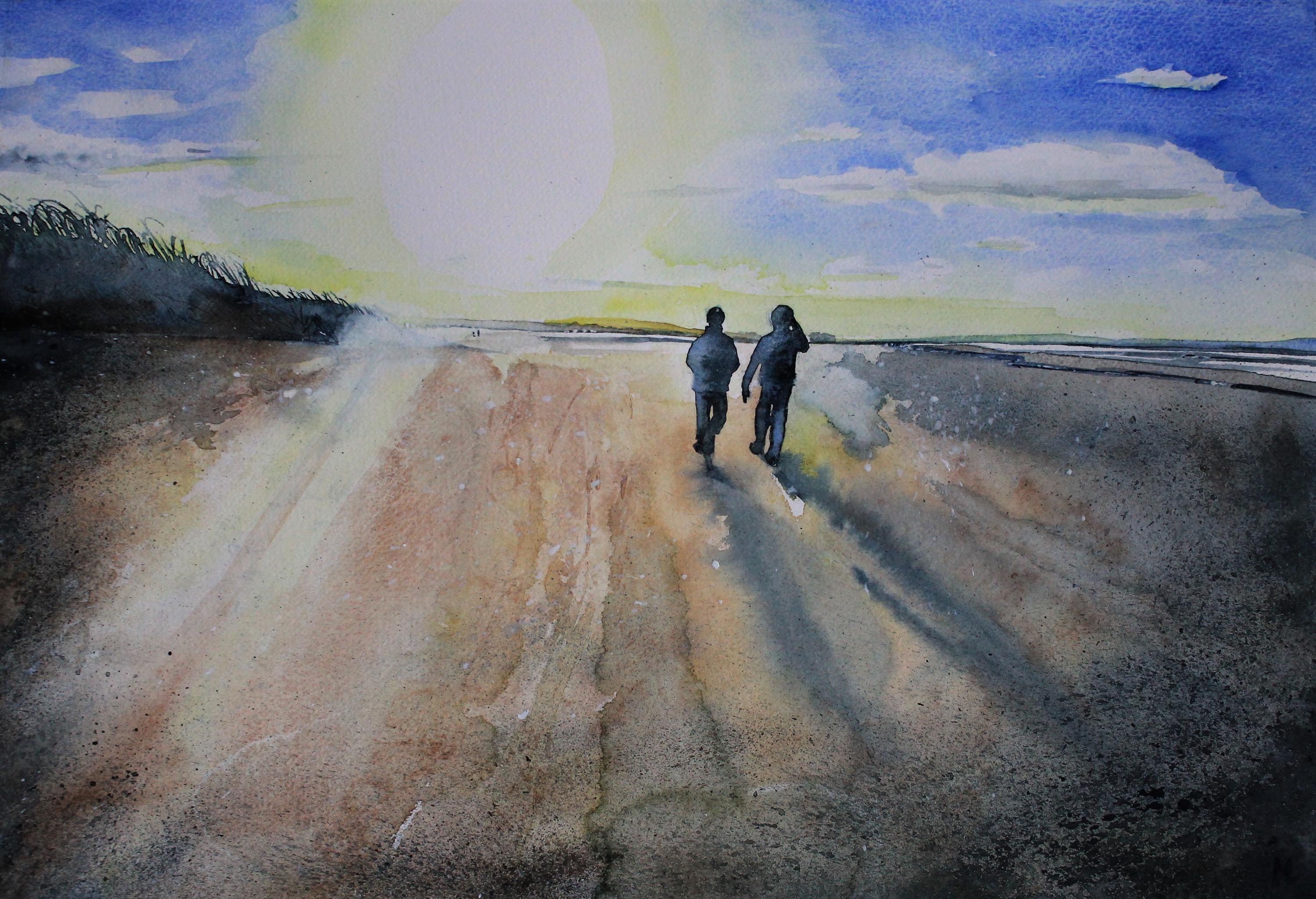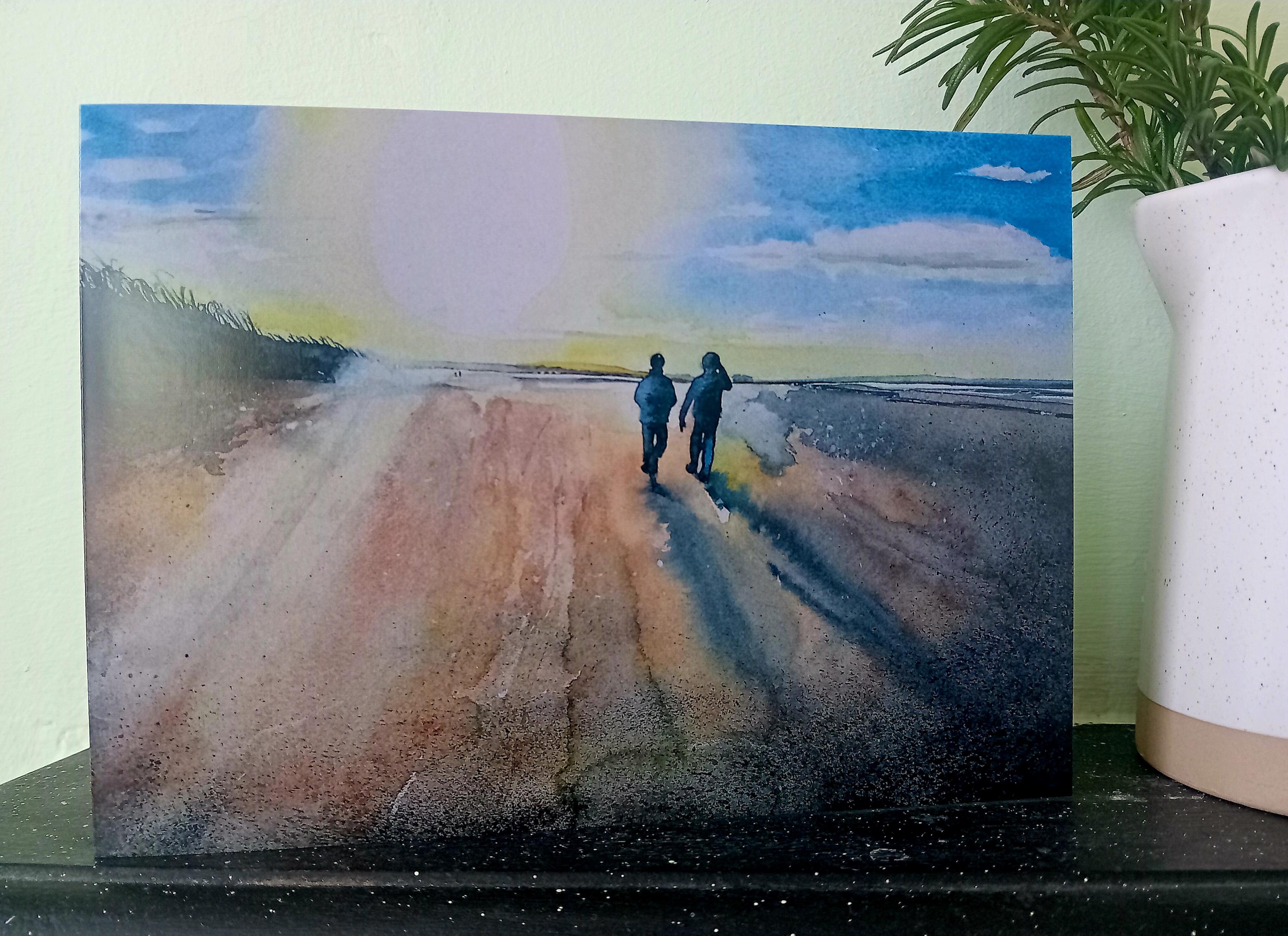This 'Walking on Berrow Beach' greetings card is from my original watercolour painting depicting two figures enjoying a late winter walk along this vast six-mile stretch of sand and mudflats in Somerset.