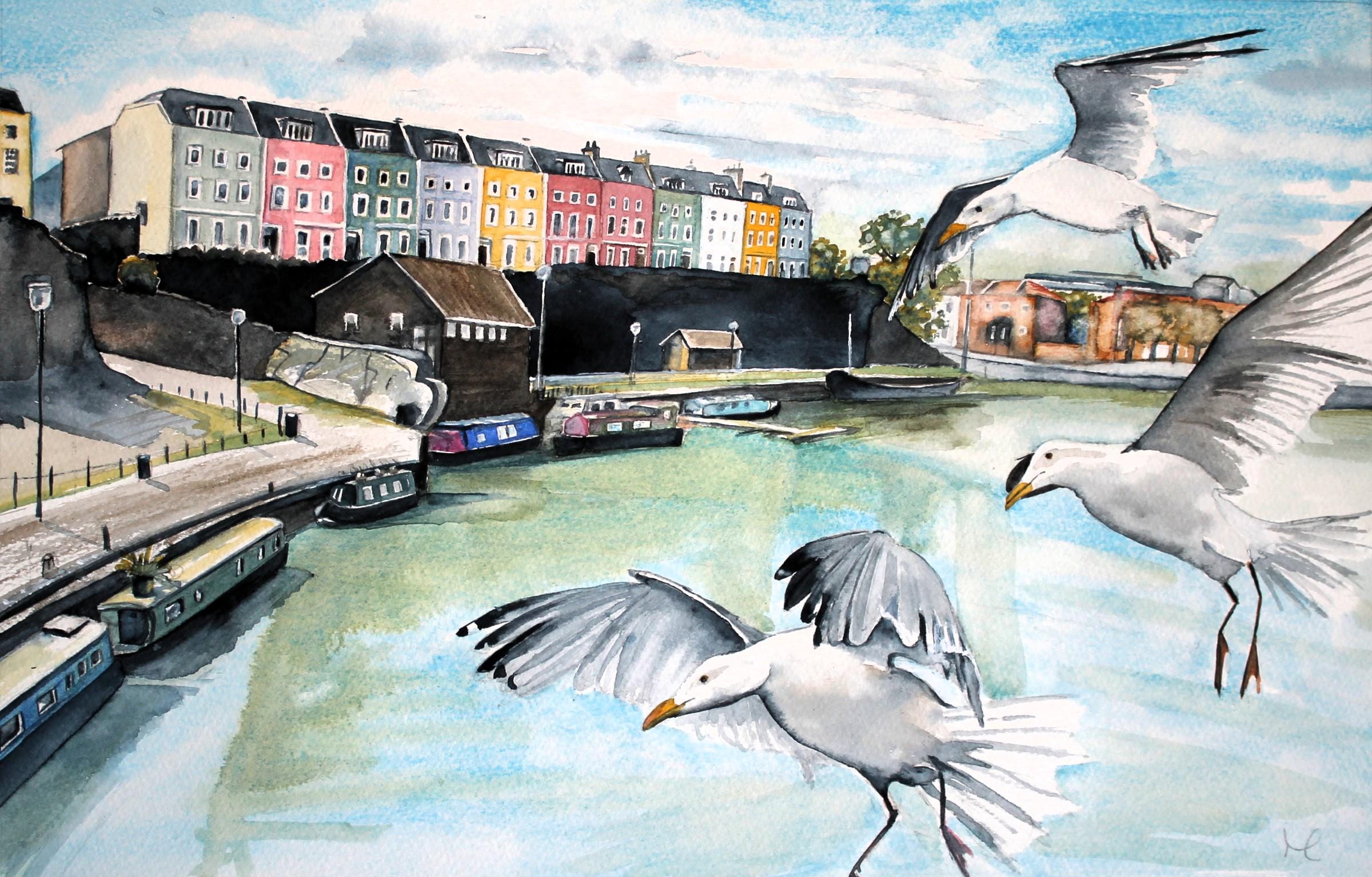 This 'Bristol Harbour' greetings card is from my original watercolour painting depicting the colourful Redcliffe Terrace in Bristol overlooking the harbour with its moored narrowboats and gulls catching the breeze.